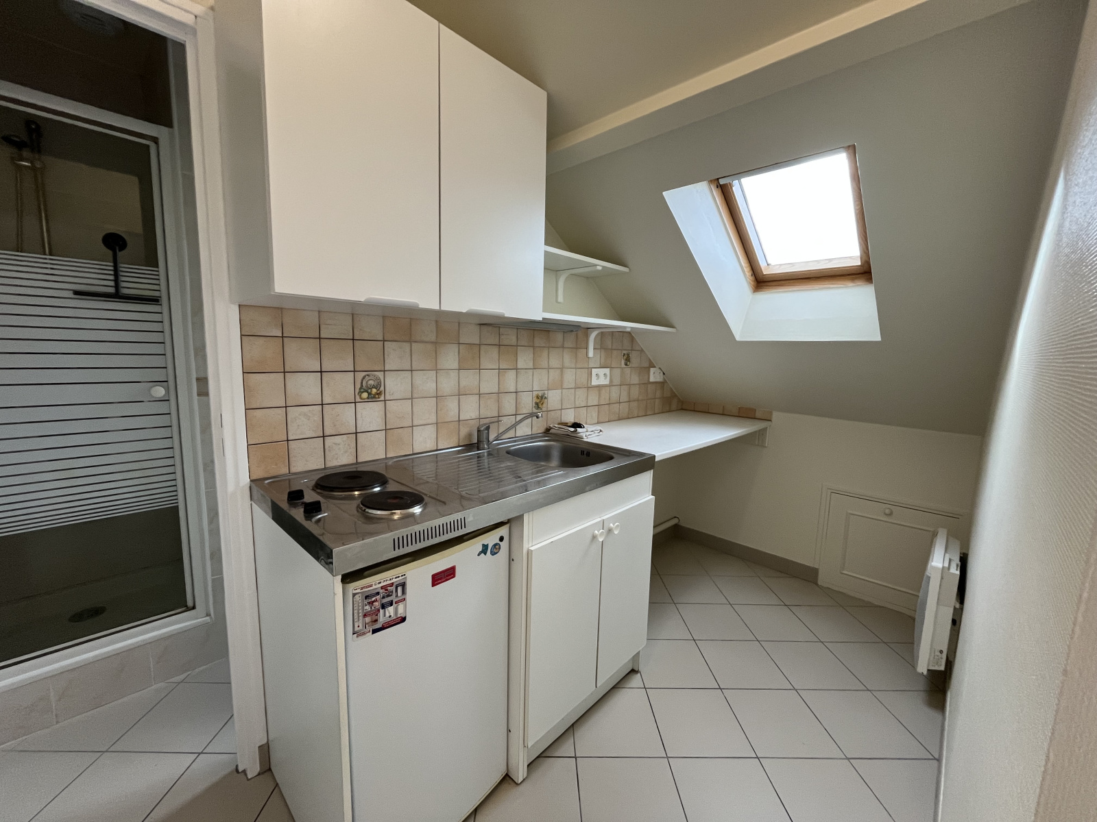 BURES SUR YVETTE - 14, rue de Villeziers - Proche des commerces et des arrêts de Bus - Ce studio d'une superficie de 17,02 m² (24,87 m² au sol) est situé au deuxième et dernier étage sans ascenseur, il comprend : un séjour avec un placard, une cuisine séparée aménagée et équipée d'une plaque de cuisson et d'un réfrigérateur et une salle d'eau avec un water-closet.