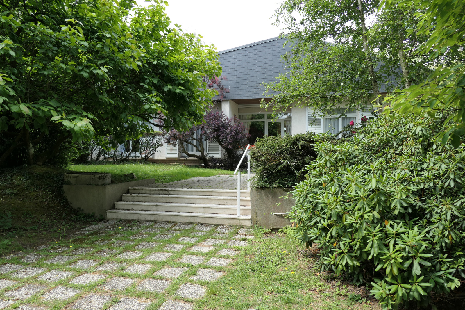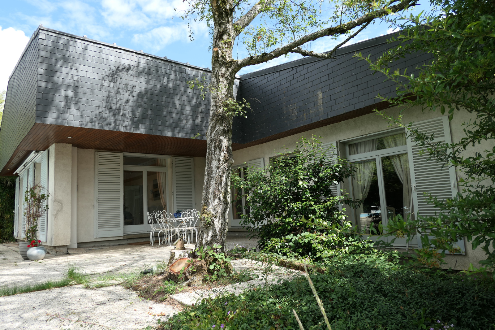 BURES SUR YVETTE : Maison d'architecte de 7 pièces d'une superficie de 185 m² de plain-pied, avec piscine, édifiée sur un terrain de 2064 m² comprend : un hall, un séjour double de 62 m² donnant au sud sur la terrasse, une cuisine aménagée, quatre chambres dont une suite parentale, une salle de bains, une salle d'eau, water-closet. Au sous/sol : une chambre avec salle d'eau, une salle de jeux de 55 m², une buanderie, une cave à vins, une chaufferie, une cave, un garage double. Porte et portail motorisés.
