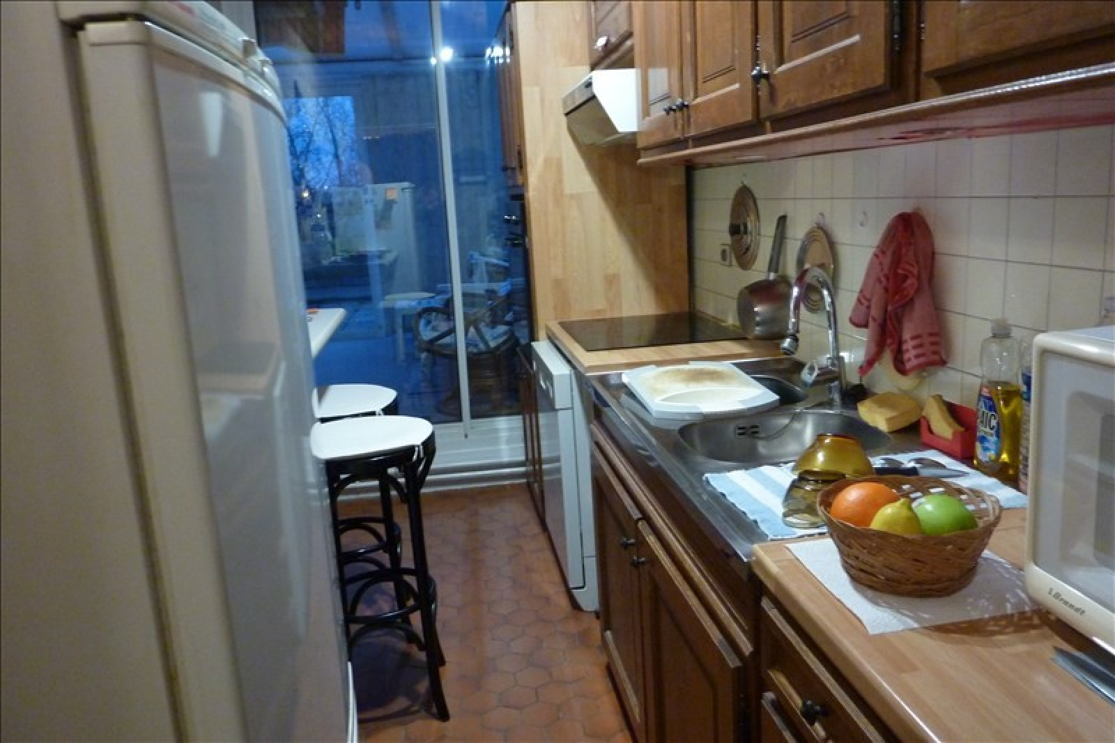 Aménagée de placards hauts et bas, équipée d'un four, d'une hotte, de plaques de cuisson. Avec une baie coulissante en alu donnant accès sur la véranda.